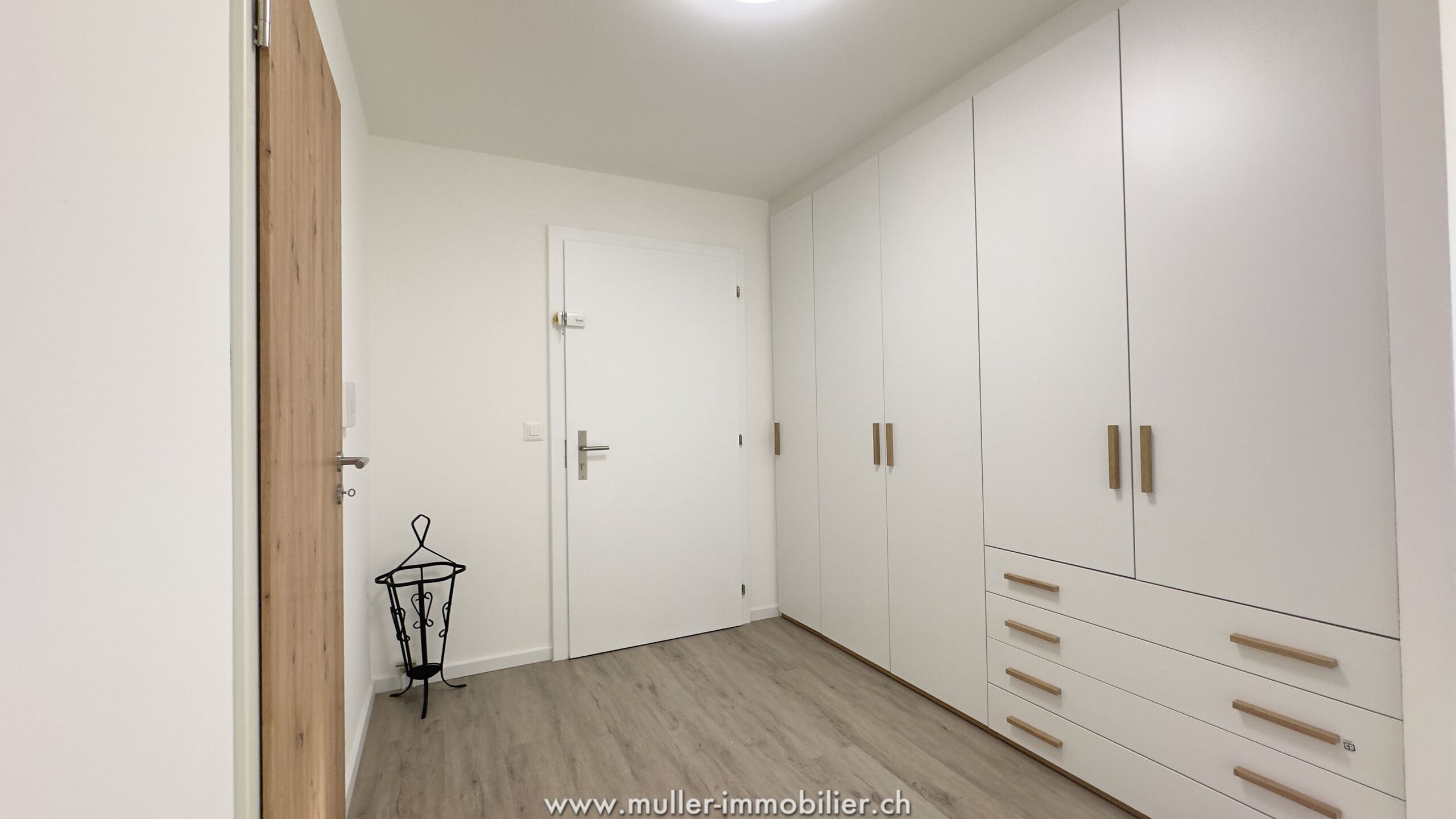 Hall d’entrée avec deux grandes armoires intégrées, un réduit, deux chambres spacieuses, une salle de bain avec machine à laver privée, cuisine ouverte sur pièce à vivre avec accès au balcon-loggia.