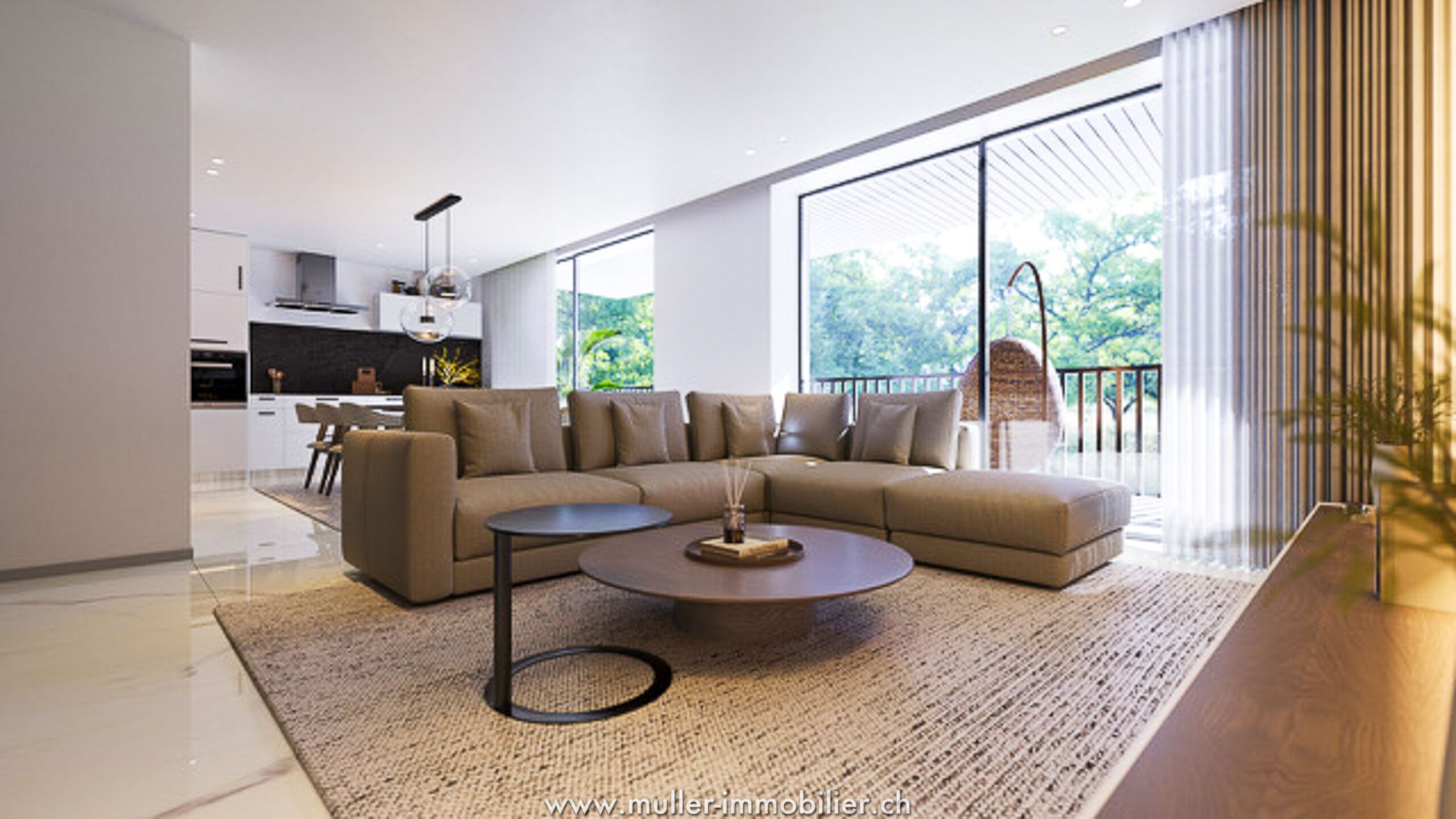 Hall d’entrée avec armoire, bel espace à vivre comprenant une cuisine équipée ouverte, salle à manger et salon avec accès à un beau balcon plein sud, deux chambres avec balcon, salle de bains avec douche à l’italienne et WC.