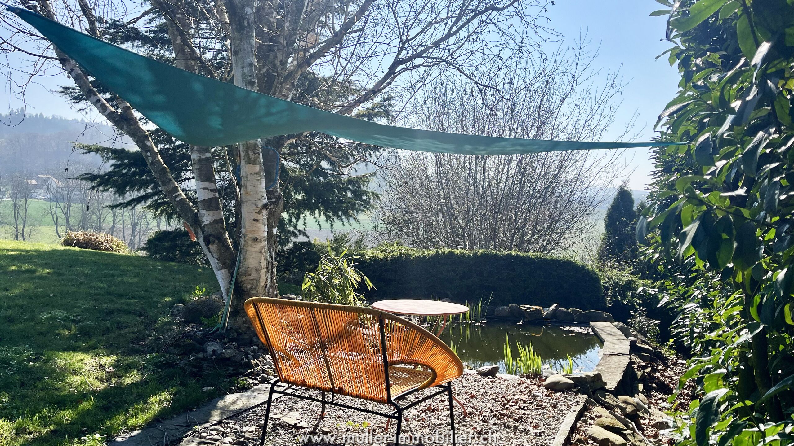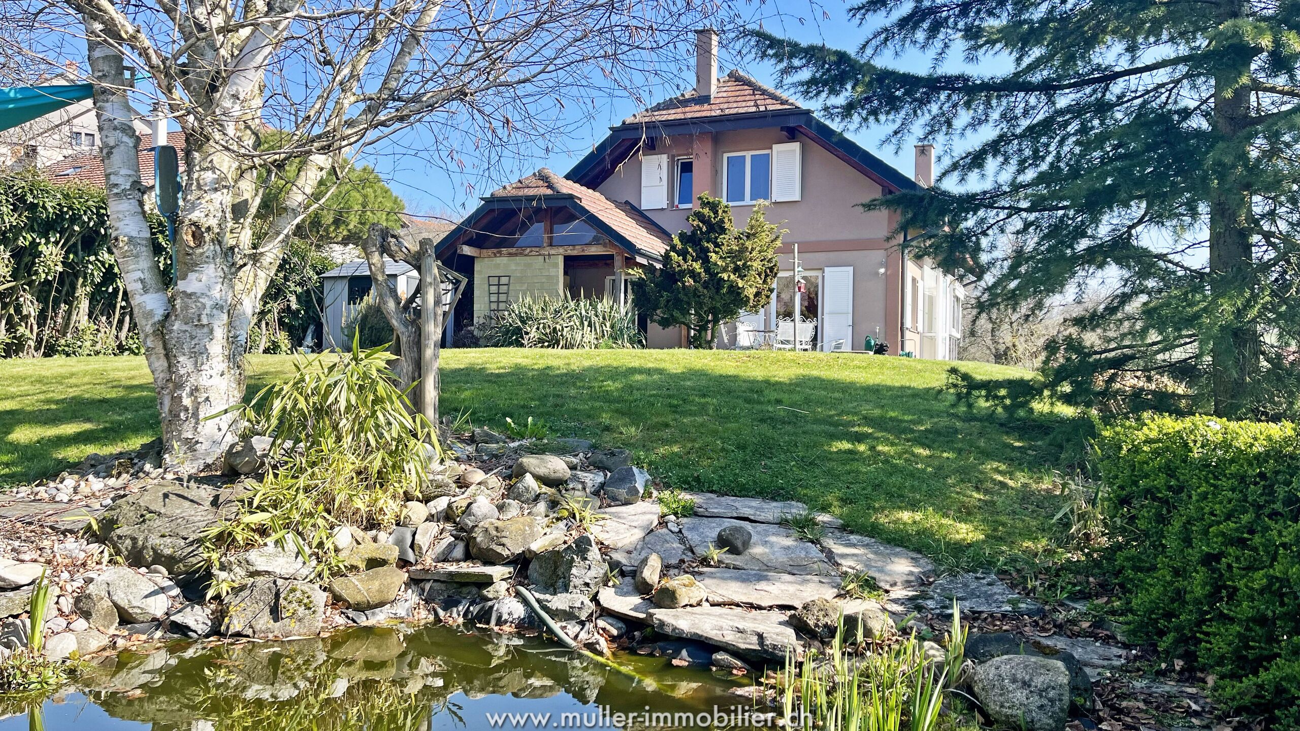Une belle terrasse couverte, un grand jardin d’agrément arboré avec un étang, un bassin en pierre, deux cabanons de jardin, 5 places de stationnement. Une entrée indépendante au rez inférieur pour le 2.5 pièces avec une terrasse privative. Le tout sur une parcelle de 847 m2.