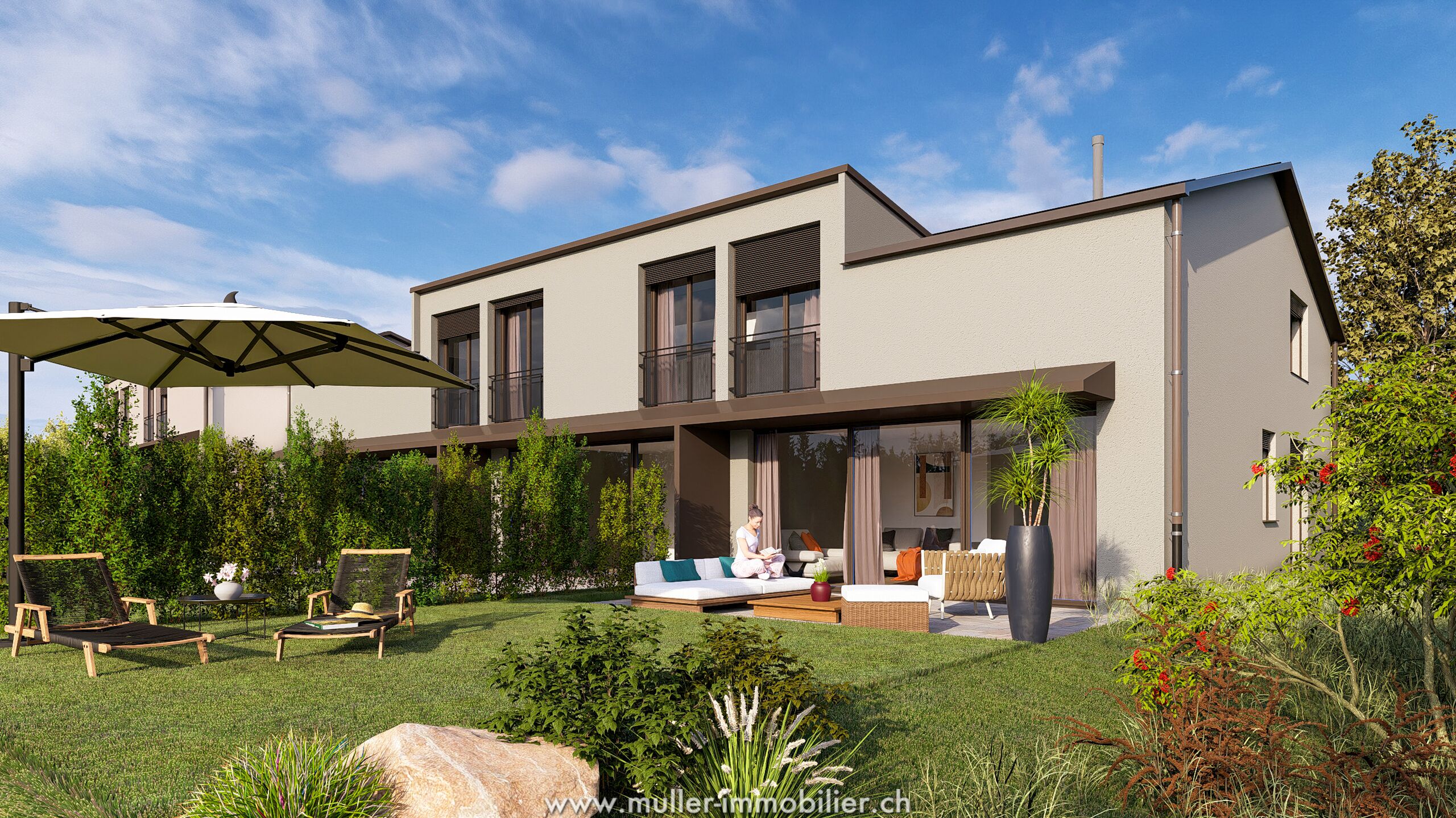 Une terrasse orientée sud-est de 14,9 m2 et un jardin. Deux places de parc extérieures, dont une sous-couvert.