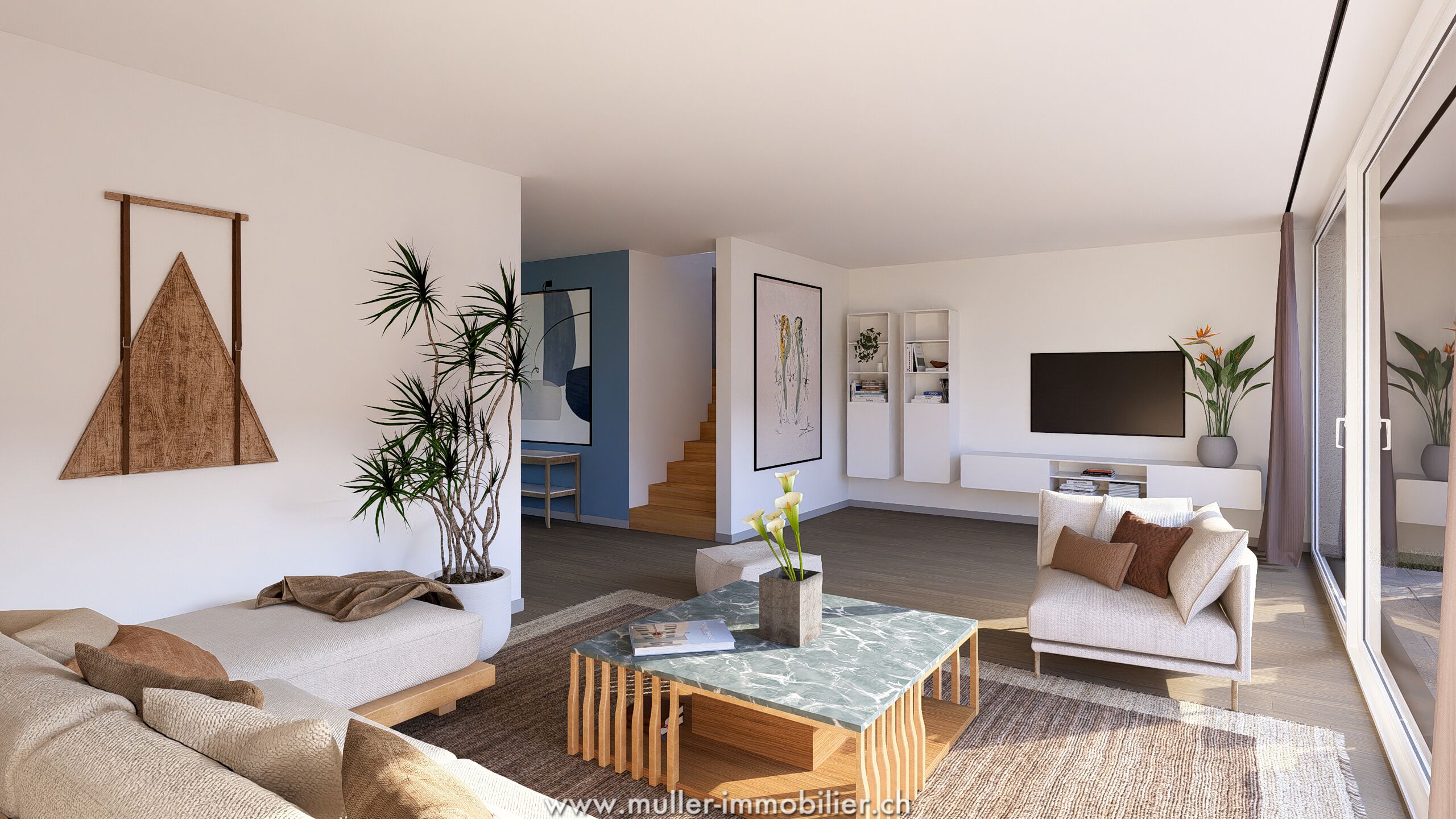 Un hall d'entrée avec armoire encastrée et WC visiteurs, une grande cuisine séparée avec salle à manger, un joli séjour avec une belle vue sur les Préalpes et un accès à la terrasse et au jardin.